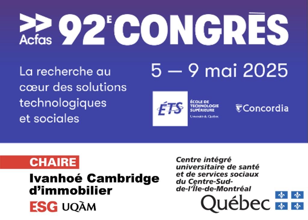 La Chaire Ivanhoé Cambridge d’immobilier de l’École des Sciences de la gestion de l’Université du Québec à Montréal (ESG UQAM) et la Direction régionale de santé publique, CIUSSS du Centre-Sud-de-l'Île-de-Montréal organisent le 7 mai 2025 un colloque intitulé Logement + Santé : Explorer les connaissances en santé et en immobilier en gestion des impacts des immeubles sur la sécurité, santé et bien-être des occupants. Ce colloque se déroulera en salle et en ligne dans le cadre du 92e Congrès de l'Acfas qui se tiendra à l’École de technologie supérieure (ETS) et à l'université Concordia à Montréal du 5 au 9 mai 2025 sur le thème « La recherche au cœur des solutions technologiques et sociales ».