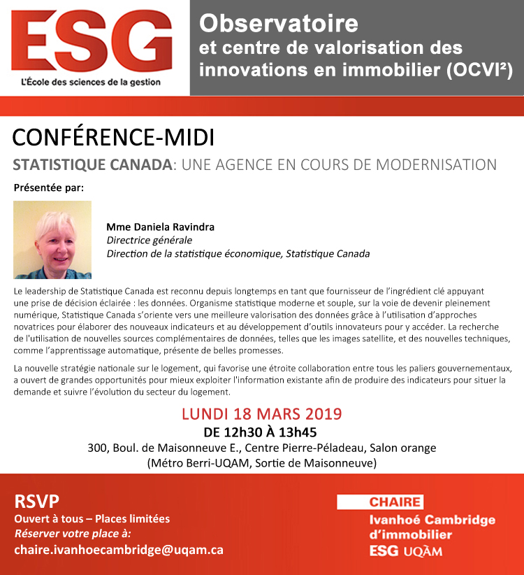Le 18 mars 2019, la Chaire Ivanhoé Cambridge d’immobilier a eu l’honneur d’accueillir Mme Daniela Ravindra – Directrice générale, Direction de la statistique économique, Statistique Canada – pour la présentation de la conférence intitulée « Statistique Canada : Une agence en cours de modernisation ». Lors de cet évènement se tenant à l’ESG UQAM, des professeurs, des chargés de cours, des professionnels et des étudiants ont eu l’occasion d’en apprendre davantage sur cet organisme gouvernemental qui est en train de restructurer et d’élargir son offre de donnée en adoptant une vision axée sur la collaboration pour relever des défis majeurs tels que la donnée en temps réel.